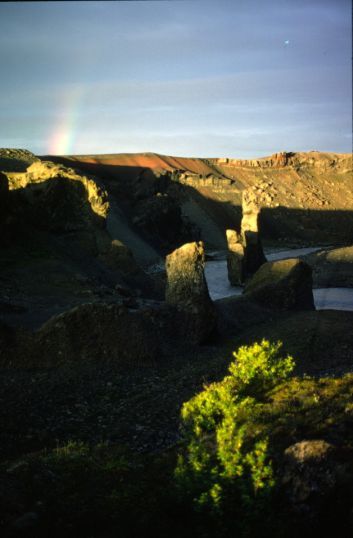 Vesturdalur, Abendsonne auf dem Rand der "Eyjan"und "Karl og Kerling"