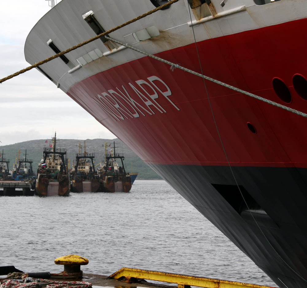 Die Nordkapp, eines der Hurtigrutenschiffe, in Kirkenes