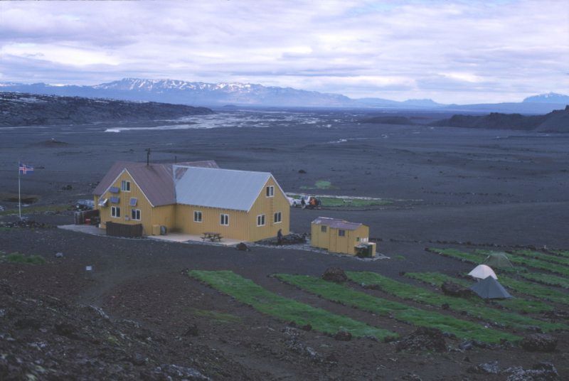 Die Hütte Siguršarskáli. Rechts die Zeltplatzstreifen