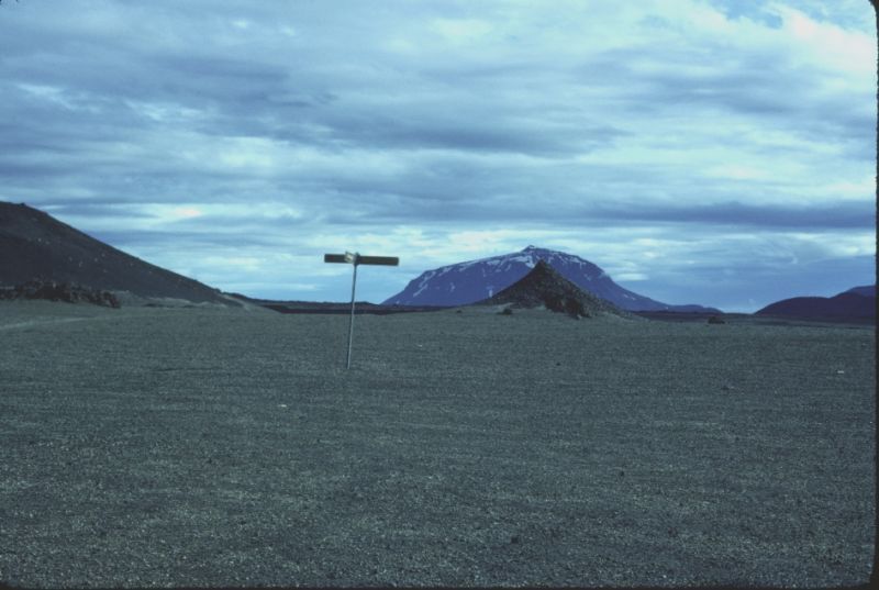 Der Wegweiser vor der Dreki-Hütte am Weg zur Askja. Im Hintergrund die Heršubreiš