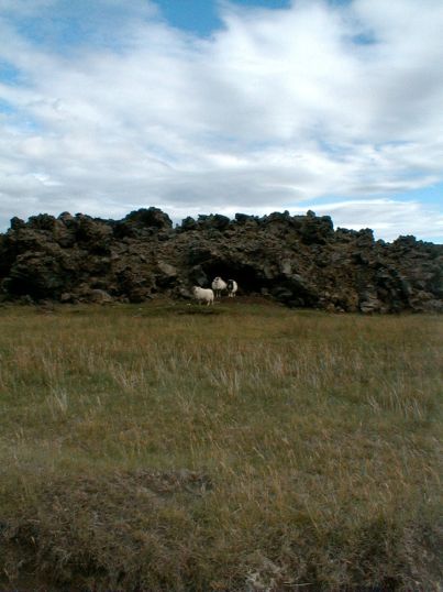Strengjabrekka: Schafe suchen Schutz in einer Lavagrotte.