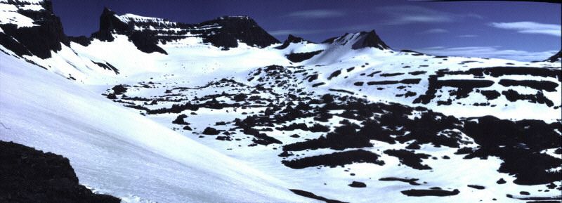 Links das Tor des Dyrfjöll. Blick aufs Bergsturzgebiet Stóruš.