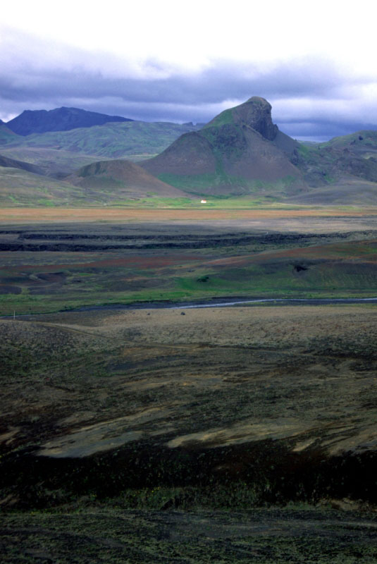 Blick über Ljósá und Markarfljótsgljúfur auf den Berg Einhyrningur.