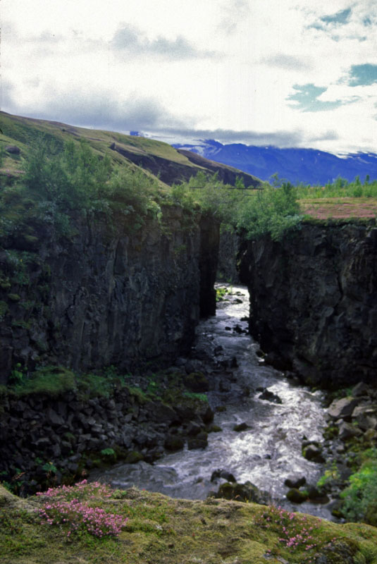 Dei von kletterfreudigen Birken gut verborgene Brücke über die Ljósá.