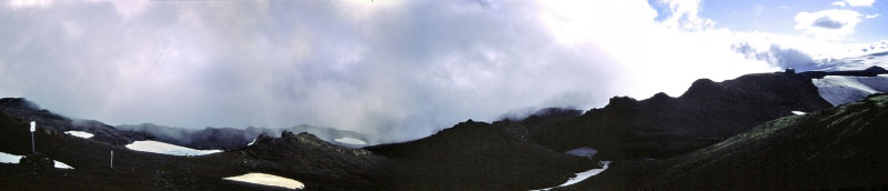 Fimmförđuháls: Oben rechts, kurz vor dem Rand des Eyjafjallajökulls ist die neue Hütte (Fimmförđuskáli) zu erkennen.
