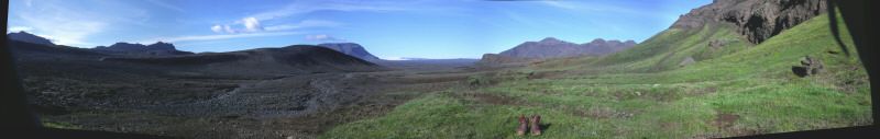 Ich fülle die Flasche an der Regentonne und breche auf, nach Eintrag ins Gästebuch und nachdem ich die Gebühr in den Blechkasten im Vorraum entrichtet habe. Sonne und blauer Himmel. Ziehe beim ersten Halt schon das Sweat-shirt aus und nehme großzügig von der Sonnenmilch. Die Kappe habe ich schon beim Aufbruch aufgesetzt. Der Weg ist teilweise sandig, aber auf der Piste durch die Autos so weit festgefahren, daß er gut gangbar ist. Ich suche nach dem Tal am Rauðafell, von dem Lisa Steppe in ihrem Reiseführer schreibt, daß es zum Zelten einlädt. Dort, wo die Piste beginnt zum Miðdalsfjäll anzusteigen, vielleicht 9 km nach der Hütte, sehe ich hinter einem Hügel links von mir etwas, das mir zumindest einladend vorkommt. Mit Gras und flachem Bewuchs bedeckte Hänge, die vor der Abbruchkante zum Flußbett stellenweise waagerechte Wiesen bilden. Das Flußbett ist nur noch eine Geröllfläche. Ich durchquere es, baue das Zelt auf und begebe mich auf die Suche nach Wasser. Dazu gehe ich auf der Piste weiter bergauf. Alle Hänge weisen tiefe Sturzbachrinnen auf, aber nirgendwo ist Wasser. Die Sonne brennt und der Anstieg ist streckenweise ziemlich steil, mir graut vor Morgen. Mit dem Rucksack wird das heftig. Der Weg hat sich zwar wegen der Aussicht allein schon gelohnt - wer weiß, wie morgen die Sicht sein wird? - aber weit und breit kein Wasser.