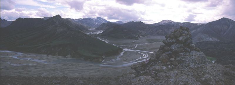 Am Abend bestieg ich noch den Bláhnúkur (Blauer Gipfel). Es war bewölkt, aber kurz vor Erreichen des Gipfels schien die tiefstehende Sonne ein Wolkenfenster und strich über die Gipfel der Rhyolithhügel, die Einer nach dem Anderen erstrahlten.