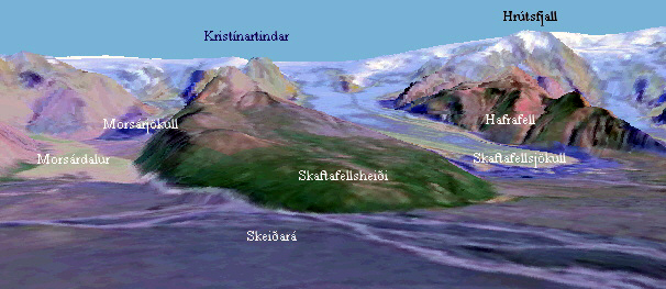 Der Nationalpark Skaftafell liegt am Südrand des Vatnajökull, des größten Gletschers Europas. Der Campingplatz befindet sich auf dem obigen Bild am rechten Rand des Bergrückens in der Mitte und ist als heller Fleck direkt unterhalb des Schriftzuges "Skaftafellsjökull" zu erkennen. Zahlreiche markierte Wanderwege durchziehen das Gebiet. Einer der beliebtesten windet sich den Hang der Skaftafellsheiği hinauf und führt zum Svartifoss (Film), ("schwarzer Wassserfall"), der über einen halbkreisförmigen Bogen von Basaltsäulen stürzt. Längere Wanderungen leiten quer durch das Morsárdalur zum Gletschertor der Skeiğará, zum Gletschersee des Morsárjökull am Ende des Morsárdalur, hinauf zum Kristínartindar oder zum Aussichtspunkt Sjónarsker, von wo sich den Augen ein beeindruckendes Panorama bietet.