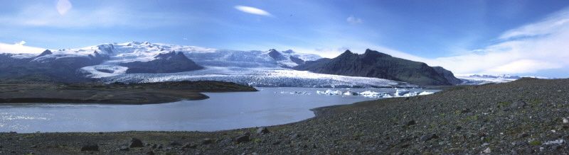 Kurz hinter der Brücke über die Fjallsá führt der Weg flußaufwärts zum ersten Gletschersee, dem Fjallsárlón. Die zerklüftete Gletscherzunge des Fjallsjökull reicht bis an den See, auf dessen Wasser Eisberge treiben. Als ich 2002 dort eintraf, war es sehr warm. Ich lief im T-shirt weiter zum zweiten Gletschersee, dem Breiğárlón. Wegen des Gerölls ist der Weg an den beiden Seen schwer zu gehen. Am Breiğárlón fischte ich mir ein klares Stück Eis aus dem See, ganz ohne Luftblasen, hackte mit dem Messer etwas davon ab und kochte mir erstmal einen Tee. Das Gas ging zur Neige, was ich mit Erschrecken feststelle. Doch der Tee war köstlich. Beim Kochen und beim Zusehen, wie das Eis schmolz, kam mir die Vorstellung, daß es schon Hunderte von Jahren alt sein konnte. Was war in Island zu der Zeit geschehen, als dieses Eis entstand (mal abgesehen davon, daß Fjalla-Eyvindur sich gerade irgendwo im Hochland eine Unterkunft baute)? Und jetzt schmolz es in relativ kurzer Zeit - in meinem Kessel.